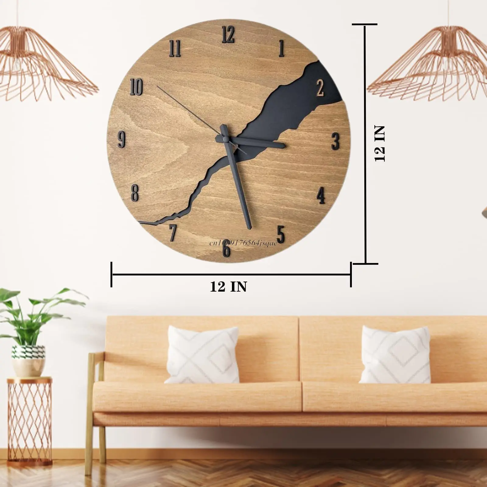 This 12-inch wall clock features a classic round shape with a wooden dial and a distinctive central crack, adding a fresh and artistic touch to any room. Designed without a glass cover, it’s easy to clean and offers a clear view of the time. The back panel is made from durable acrylic for long-lasting use.